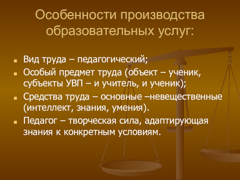 Слайд 4Особенности производства образовательных услуг: