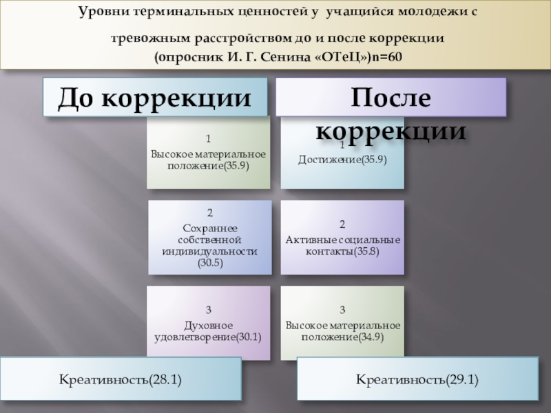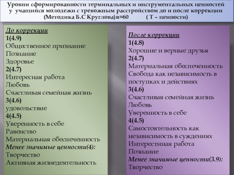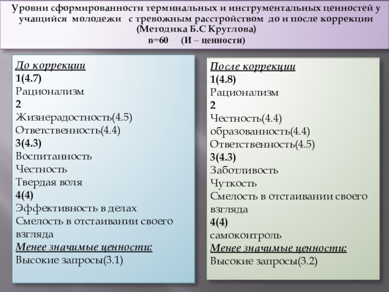 Уровни сформированности терминальных и инструментальных ценностей у учащийся молодежи с тревожным расстройством до и после коррекции