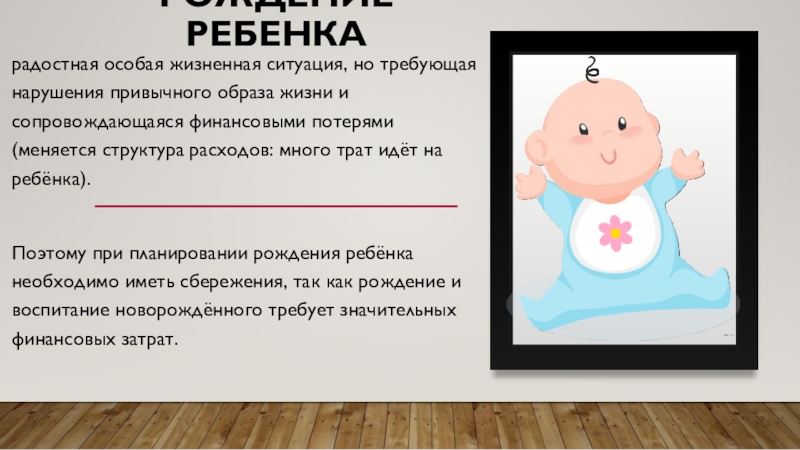 Рождение ребенкарадостная особая жизненная ситуация, но требующая нарушения привычного образа жизни и сопровождающаяся финансовыми потерями (меняется структура