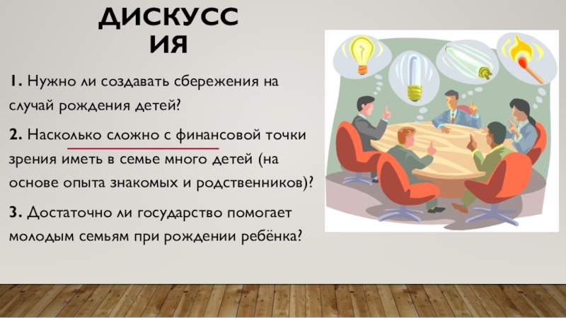 дискуссия1. Нужно ли создавать сбережения на случай рождения детей?2. Насколько сложно с финансовой точки зрения иметь в