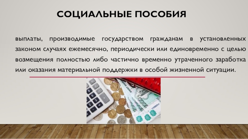 Социальные пособиявыплаты, производимые государством гражданам в установленных законом случаях ежемесячно, периодически или единовременно с целью возмещения полностью