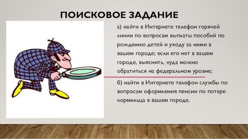 Поисковое заданиеа) найти в Интернете телефон горячей линии по вопросам выплаты пособий по рождению детей и уходу