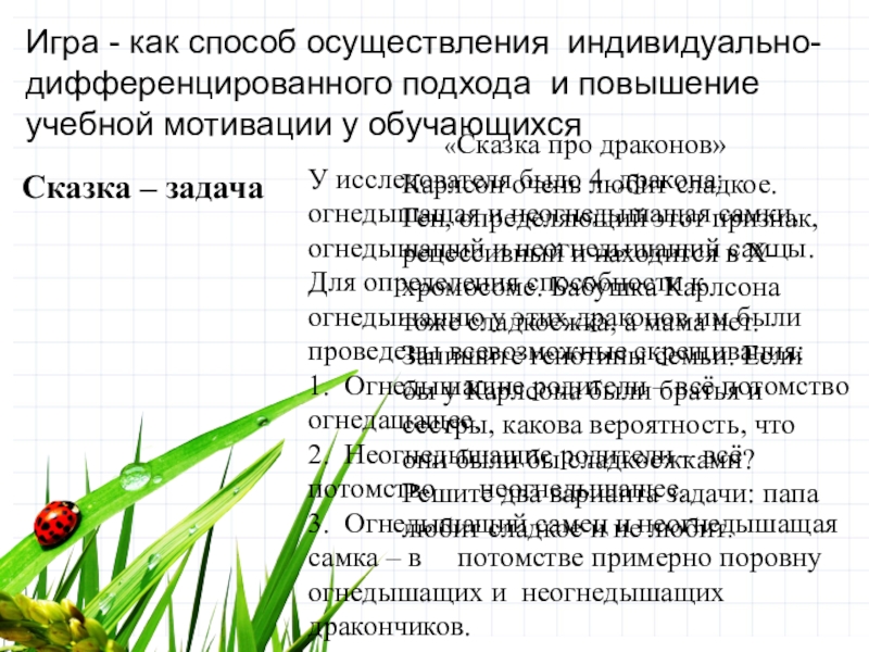 3. Огнедышащий самец и неогнедышащая самка – в потомстве примерно поровну огнедышащих и неогнедышащих дракончиков.