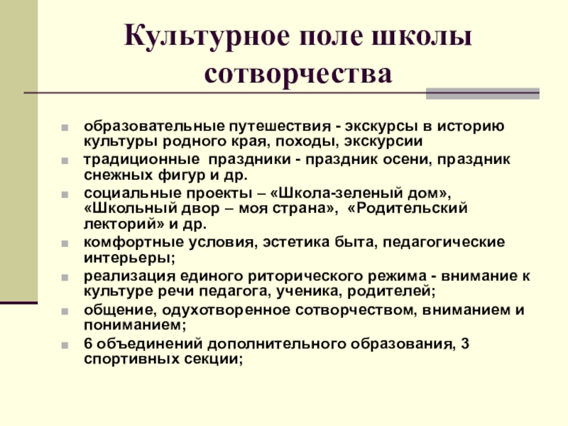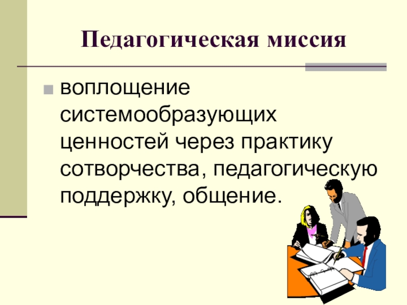 воплощение системообразующих ценностей через практику сотворчества, педагогическую поддержку, общение.