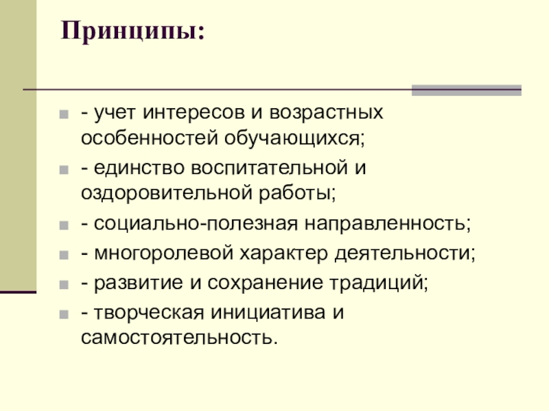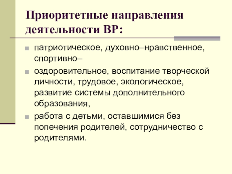 оздоровительное, воспитание творческой личности, трудовое, экологическое,