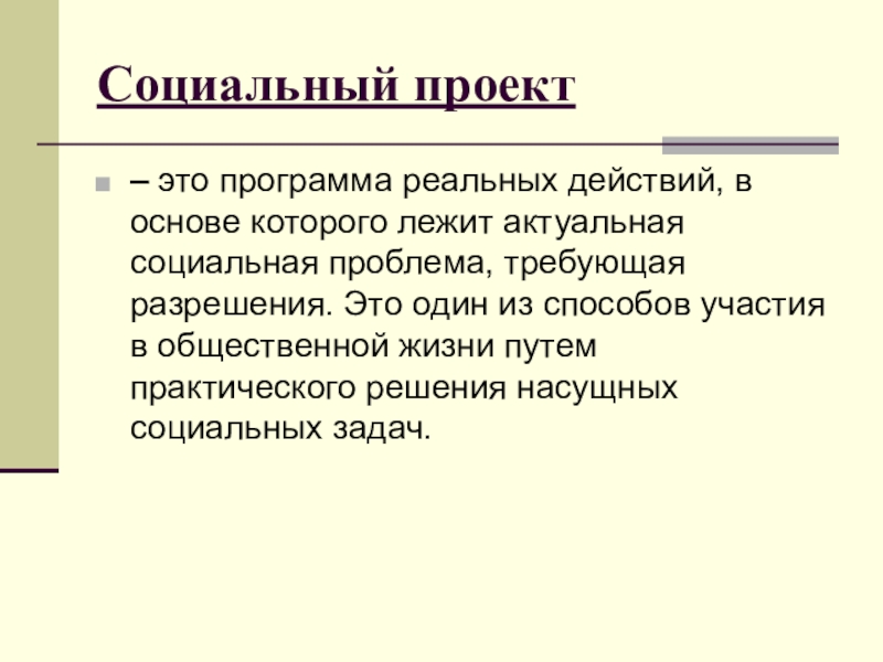 социальная проблема, требующая разрешения. Это один из способов участия в общественной жизни путем практического решения насущных социальных задач.