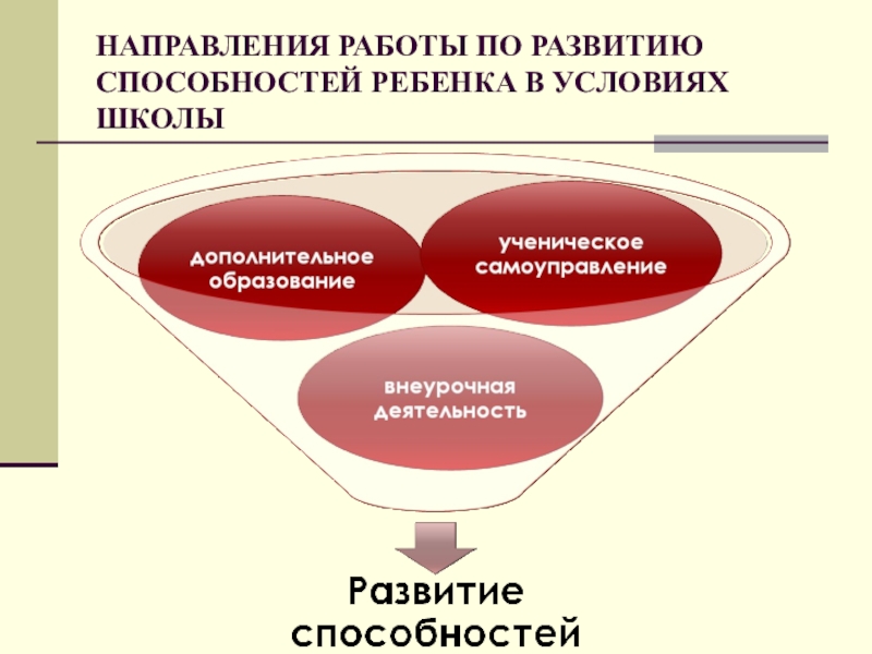 Слайд 18НАПРАВЛЕНИЯ РАБОТЫ ПО РАЗВИТИЮ СПОСОБНОСТЕЙ РЕБЕНКА В УСЛОВИЯХ ШКОЛЫ
