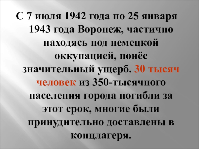 С 7 июля 1942 года по 25 января 1943 года Воронеж, частично находясь под немецкой оккупацией, понёс