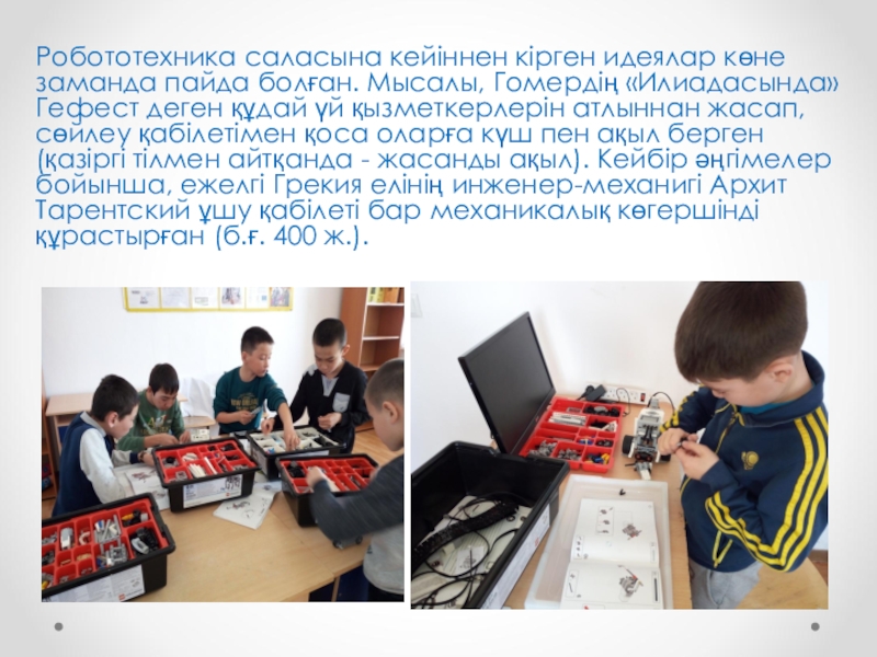 Слайд 4Робототехника саласына кейіннен кірген идеялар көне заманда пайда болған. Мысалы, Гомердің