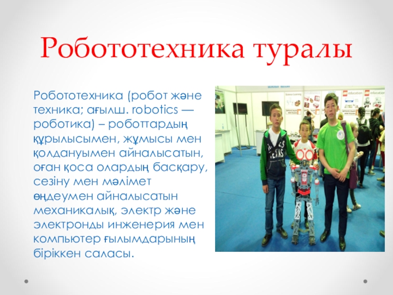 Робототехника туралыРобототехника (робот және техника; ағылш. robotics — роботика) – роботтардың құрылысымен, жұмысы мен қолдануымен айналысатын, оған қоса олардың басқару, сезіну мен мәлімет өңдеумен айналысатын механикалық, электр және электронды инженерия мен компьютер ғылымдарының біріккен саласы.