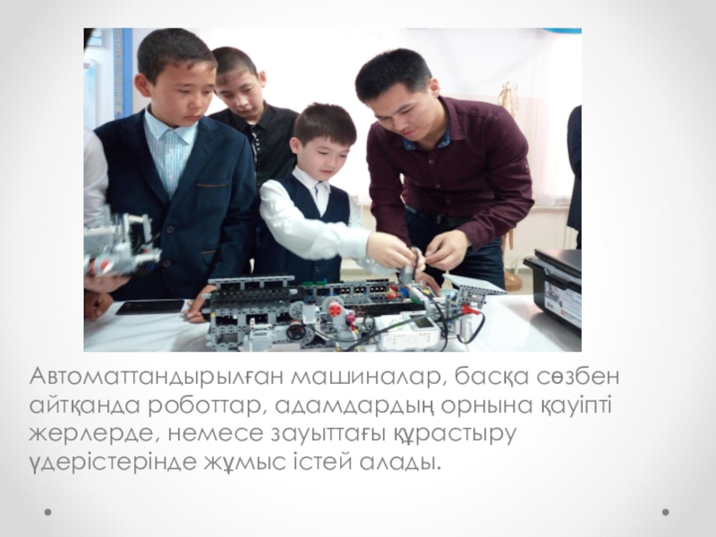 Слайд 3Автоматтандырылған машиналар, басқа сөзбен айтқанда роботтар, адамдардың орнына қауіпті жерлерде, немесе