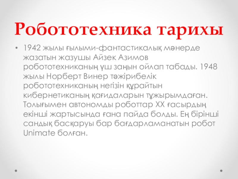 Робототехника тарихы1942 жылы ғылыми-фантастикалық мәнерде жазатын жазушы Айзек Азимов робототехниканың үш заңын ойлап табады. 1948 жылы Норберт