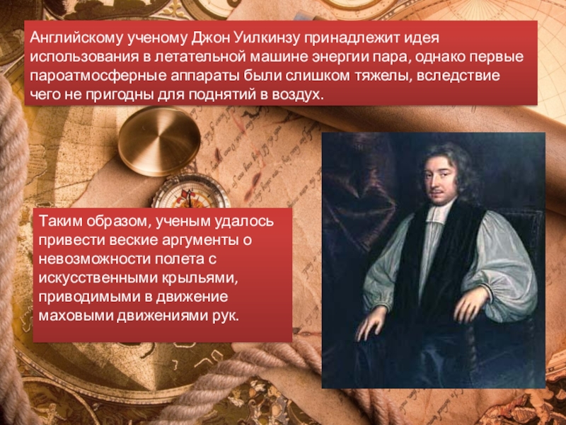 Английскому ученому Джон Уилкинзу принадлежит идея использования в летательной машине энергии пара, однако первые пароатмосферные аппараты были слишком тяжелы, вследствие чего не пригодны для поднятий в воздух.