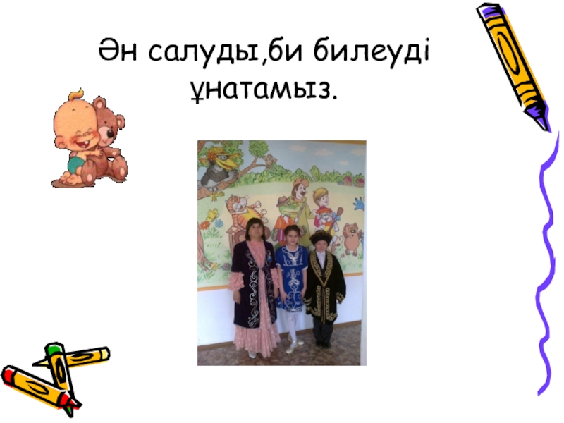 Слайд 13Ән салуды,би билеуді ұнатамыз.