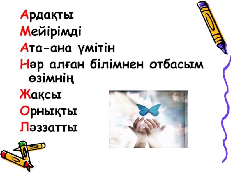 АрдақтыМейірімдіАта-ана үмітінНәр алған білімнен отбасым өзімніңЖақсыОрнықтыЛәззатты