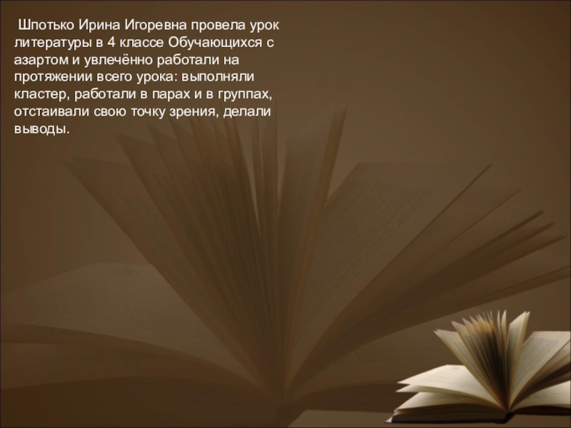 Слайд 13 Шпотько Ирина Игоревна провела урок литературы в 4 классе Обучающихся