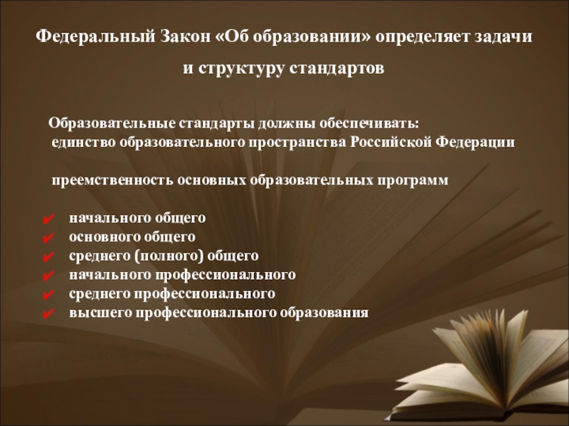 Слайд 4Федеральный Закон «Об образовании» определяет задачи и структуру стандартов