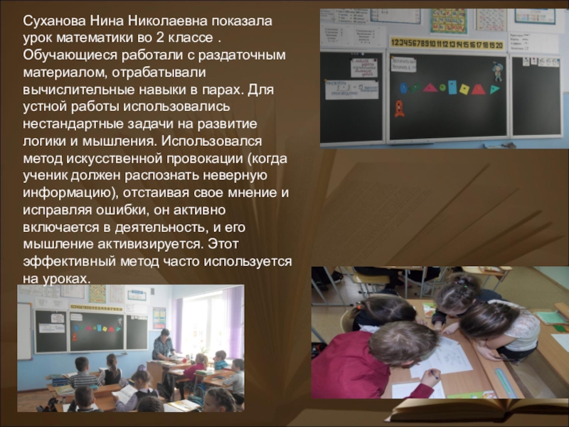 Слайд 12Суханова Нина Николаевна показала урок математики во 2 классе .Обучающиеся работали