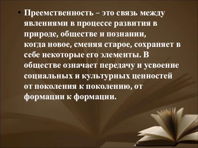 и познании, когда новое, сменяя старое, сохраняет в себе некоторые его элементы. В обществе означает передачу и усвоение социальных и культурных ценностей от поколения к поколению, от формации к формации.