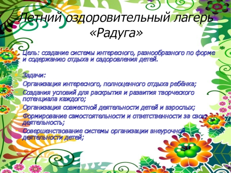 Летний оздоровительный лагерь «Радуга»Цель: создание системы интересного, разнообразного по форме и содержанию отдыха и оздоровления детей.Задачи: Организация