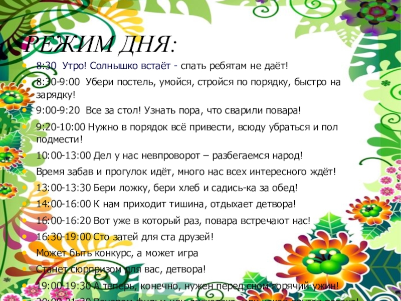 РЕЖИМ ДНЯ:8:30 Утро! Солнышко встаёт - спать ребятам не даёт!8:30-9:00 Убери постель, умойся, стройся по порядку, быстро