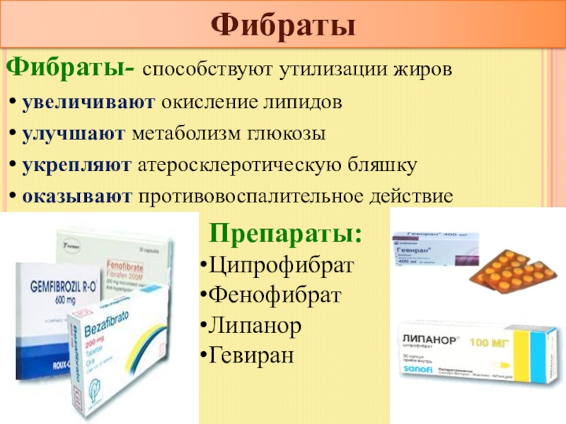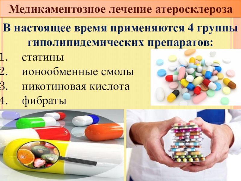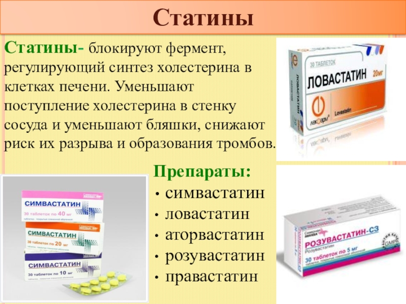 Статины- блокируют фермент, регулирующий синтез холестерина в клетках печени. Уменьшают поступление