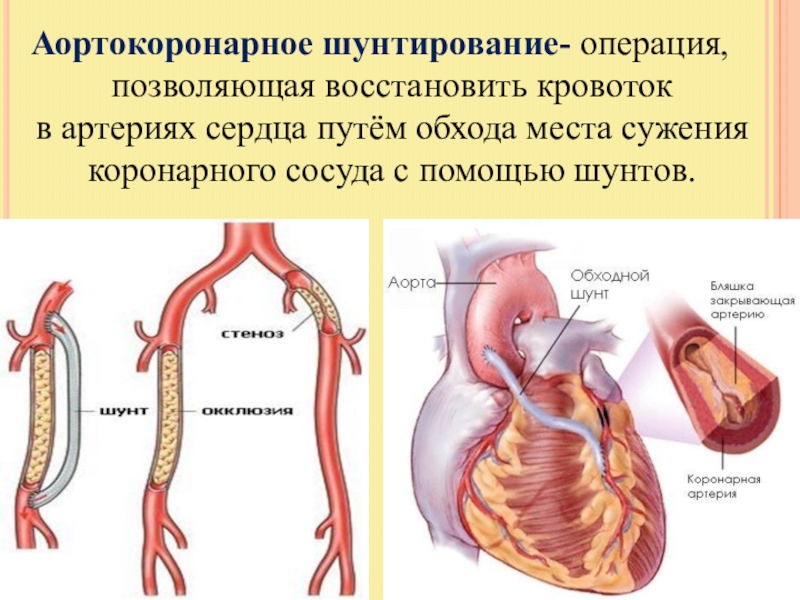 Слайд 53Аортокоронарное шунтирование- операция, позволяющая восстановить кровоток в артериях сердца путём обхода места сужения коронарного сосуда с помощью шунтов.