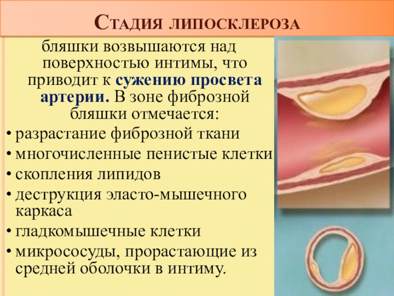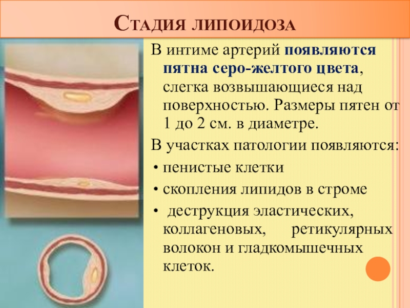 В интиме артерий появляются пятна серо-желтого цвета, слегка возвышающиеся над