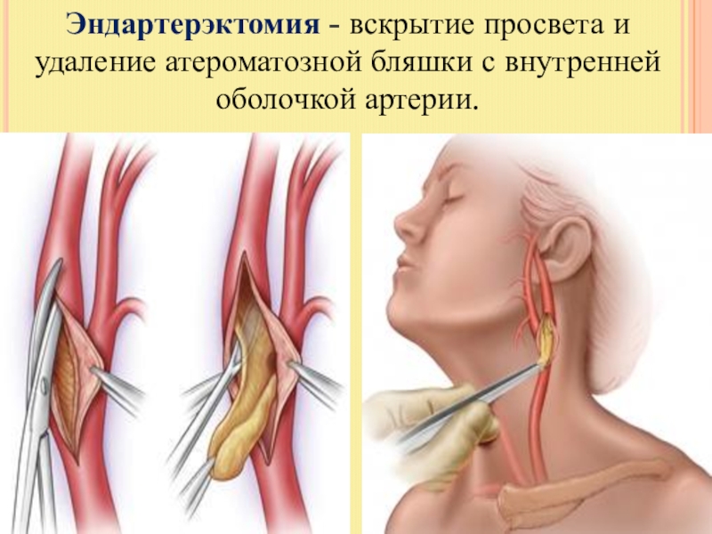 Слайд 57Эндартерэктомия - вскрытие просвета и удаление атероматозной бляшки с внутренней оболочкой