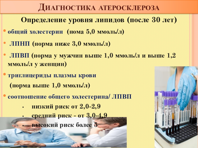 Повышенный уровень ЛПНП - более 3,0 ммоль/л является фактором риска развития атеросклероза, а уровень > 4,0 ммоль/л расценивается как высокая степень риска развития атеросклероза и ИБС.