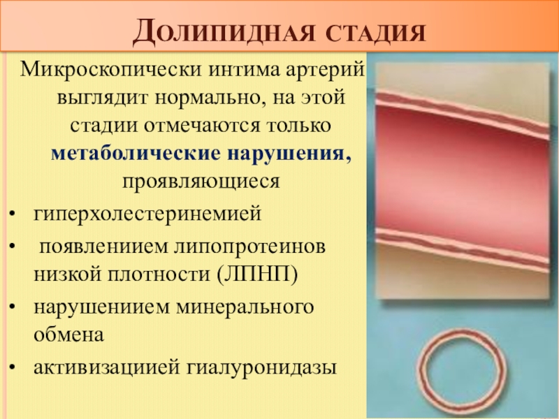 Микроскопически интима артерий выглядит нормально, на этой стадии отмечаются только
