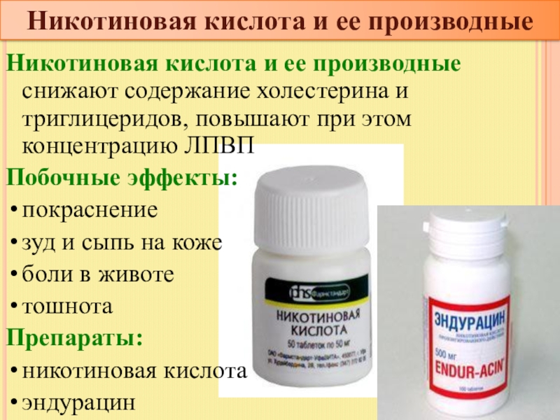 Слайд 50Никотиновая кислота и ее производные снижают содержание холестерина и триглицеридов, повышают
