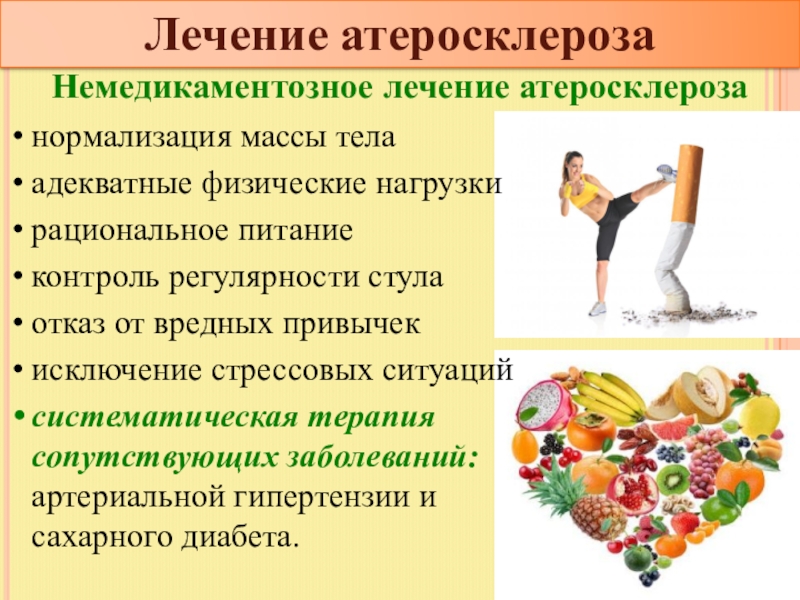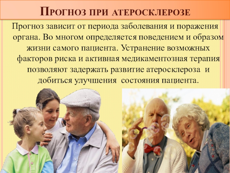 определяется поведением и образом жизни самого пациента. Устранение возможных факторов риска и активная медикаментозная терапия позволяют задержать развитие атеросклероза и добиться улучшения состояния пациента.