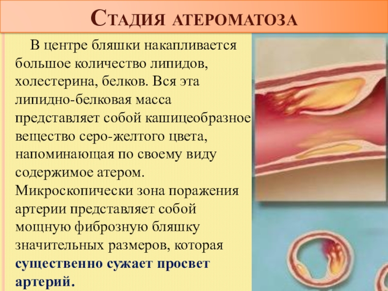 липидов, холестерина, белков. Вся эта липидно-белковая масса представляет собой кашицеобразное вещество серо-желтого цвета, напоминающая по своему виду содержимое атером. Микроскопически зона поражения артерии представляет собой мощную фиброзную бляшку значительных размеров, которая существенно сужает просвет артерий.