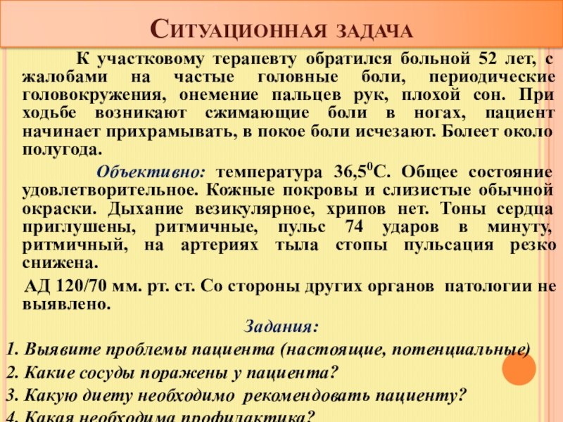 больной 52 лет, с жалобами на частые головные боли, периодические головокружения, онемение пальцев рук, плохой сон. При ходьбе возникают сжимающие боли в ногах, пациент начинает прихрамывать, в покое боли исчезают. Болеет около полугода.