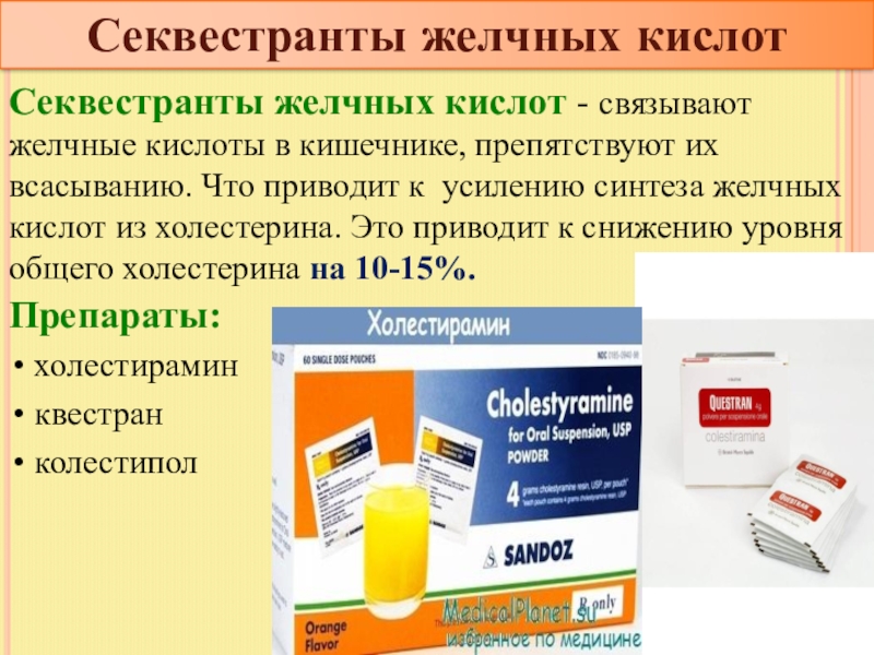 Секвестранты желчных кислот - связывают желчные кислоты в кишечнике, препятствуют их