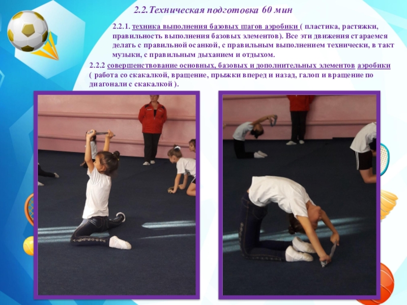 2.2.2 совершенствование основных, базовых и дополнительных элементов аэробики ( работа со скакалкой, вращение, прыжки вперед и назад, галоп и вращение по диагонали с скакалкой ).