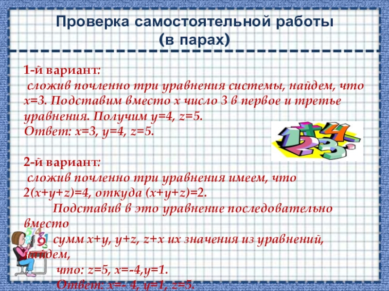 сложив почленно три уравнения системы, найдем, что х=3. Подставим вместо х число 3 в первое и третье уравнения. Получим у=4, z=5.
