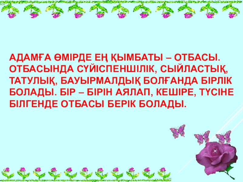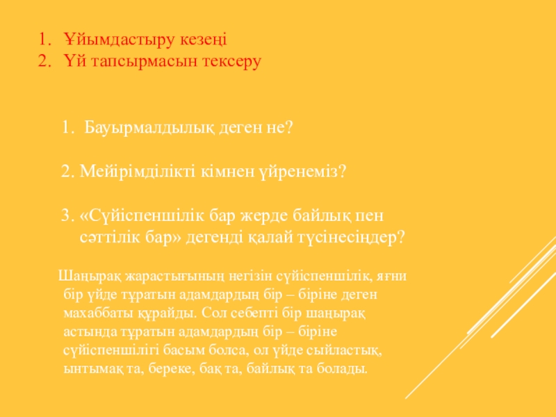 Шаңырақ жарастығының негізін сүйіспеншілік, яғни бір үйде тұратын адамдардың бір – біріне деген махаббаты құрайды. Сол себепті бір шаңырақ астында тұратын адамдардың бір – біріне сүйіспеншілігі басым болса, ол үйде сыйластық, ынтымақ та, береке, бақ та, байлық та болады.