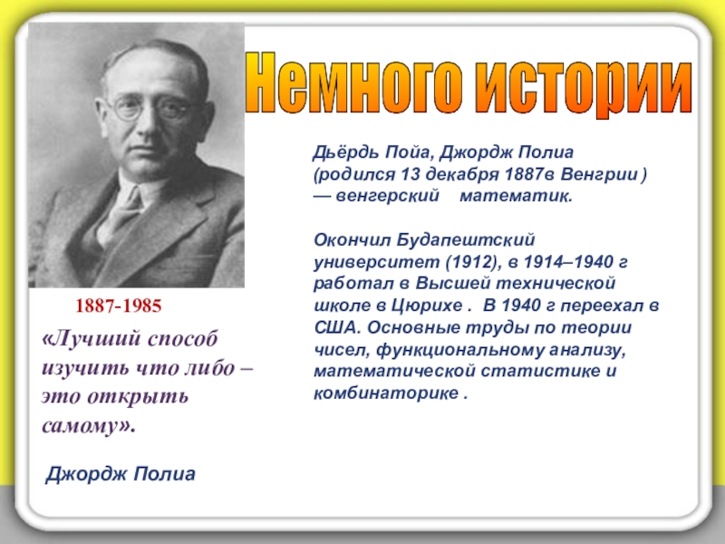 Окончил Будапештский университет (1912), в 1914–1940 г работал в Высшей технической школе в Цюрихе . В 1940 г переехал в США. Основные труды по теории чисел, функциональному анализу, математической статистике и комбинаторике .