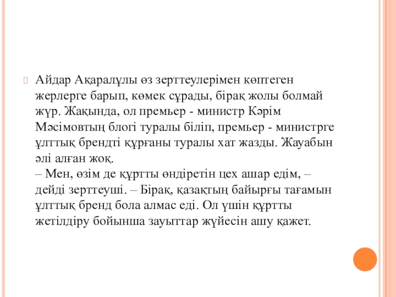 Слайд 15Айдар Ақаралұлы өз зерттеулерімен көптеген жерлерге барып, көмек сұрады, бірақ жолы