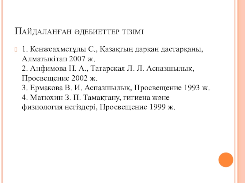4. Матюхин З. П. Тамақтану, гигиена және физиология негіздері, Просвещение 1999 ж.