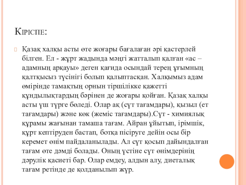 жұрт жадында мәңгі жатталып қалған «ас – адамның арқауы» деген қағида осындай терең ұғымның қалтқысыз түсінігі болып қалыптасқан. Халқымыз адам өмірінде тамақтың орнын тіршілікке қажетті құндылықтардың бәрінен де жоғары қойған. Қазақ халқы асты үш түрге бөледі. Олар ақ (сүт тағамдары), қызыл (ет тағамдары) және көк (жеміс тағамдары).Сүт - химиялық құрамы жағынан тамаша тағам. Айран ұйытып, ірімшік, құрт кептіруден бастап, ботқа пісіруге дейін осы бір керемет өнім пайдаланылады. Ал сүт қосып дайындалған тағам өте дәмді болады. Оның үстіне сүт өнімдерінің дәрулік қасиеті бар. Олар емдеу, алдын алу, диеталық тағам ретінде де қолданылып жүр.