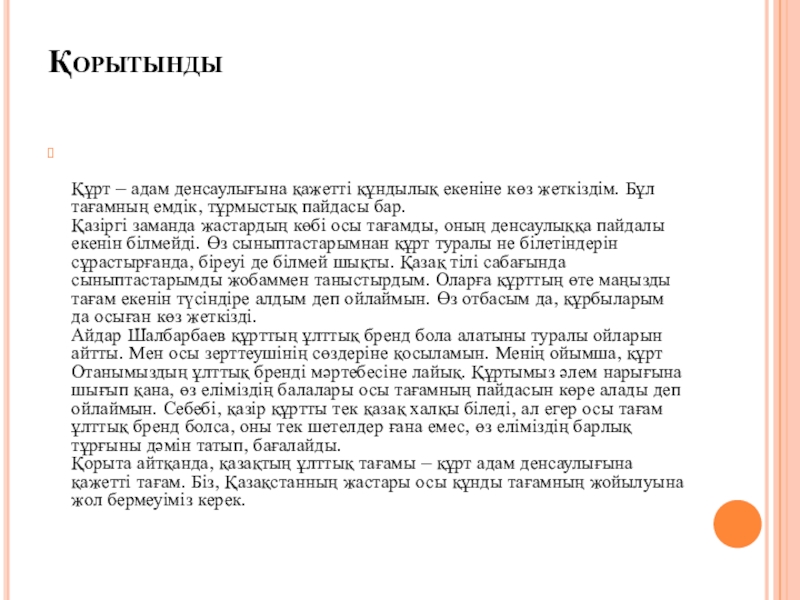 Қорыта айтқанда, қазақтың ұлттық тағамы – құрт адам денсаулығына қажетті тағам. Біз, Қазақстанның жастары осы құнды тағамның жойылуына жол бермеуіміз керек.