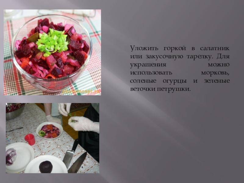 Слайд 21Уложить горкой в салатник или закусочную тарелку. Для украшения можно использовать