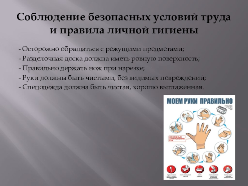 Слайд 8Соблюдение безопасных условий труда и правила личной гигиены