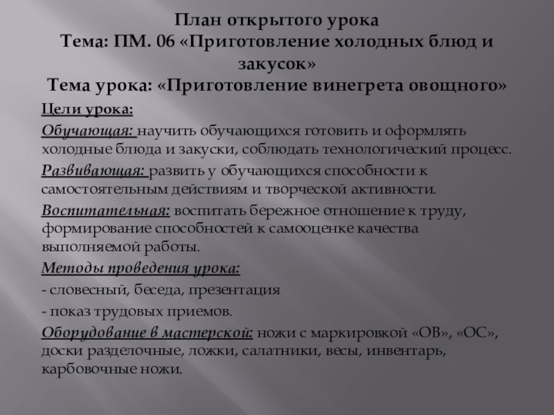 Обучающая: научить обучающихся готовить и оформлять холодные блюда и закуски, соблюдать технологический процесс.