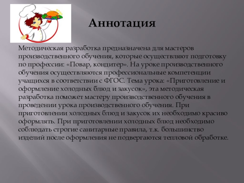профессии: «Повар, кондитер». На уроке производственного обучения осуществляются профессиональные компетенции учащихся в соответствии с ФГОС. Тема урока: «Приготовление и оформление холодных блюд и закусок», эта методическая разработка поможет мастеру производственного обучения в проведении урока производственного обучения. При приготовлении холодных блюд и закусок их необходимо красиво оформлять. При приготовлении холодных блюд необходимо соблюдать строгие санитарные правила, т.к. большинство изделий после оформления не подвергаются тепловой обработке.