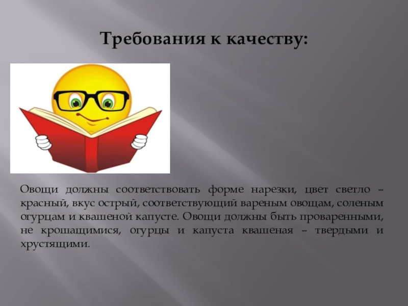 Овощи должны соответствовать форме нарезки, цвет светло – красный,