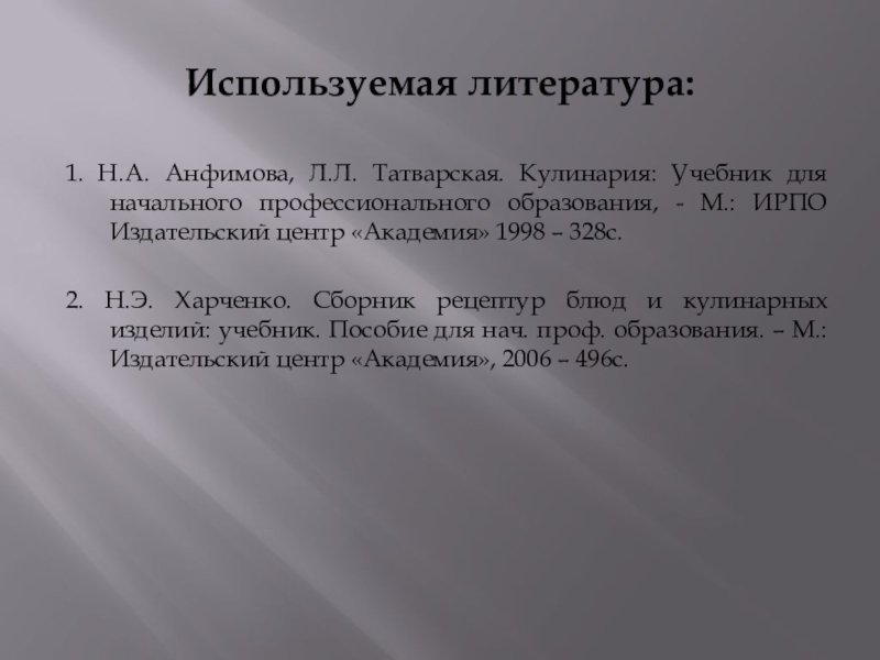 1. Н.А. Анфимова, Л.Л. Татварская. Кулинария: Учебник для начального профессионального